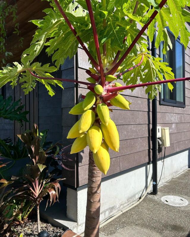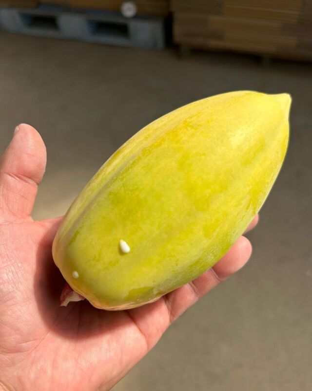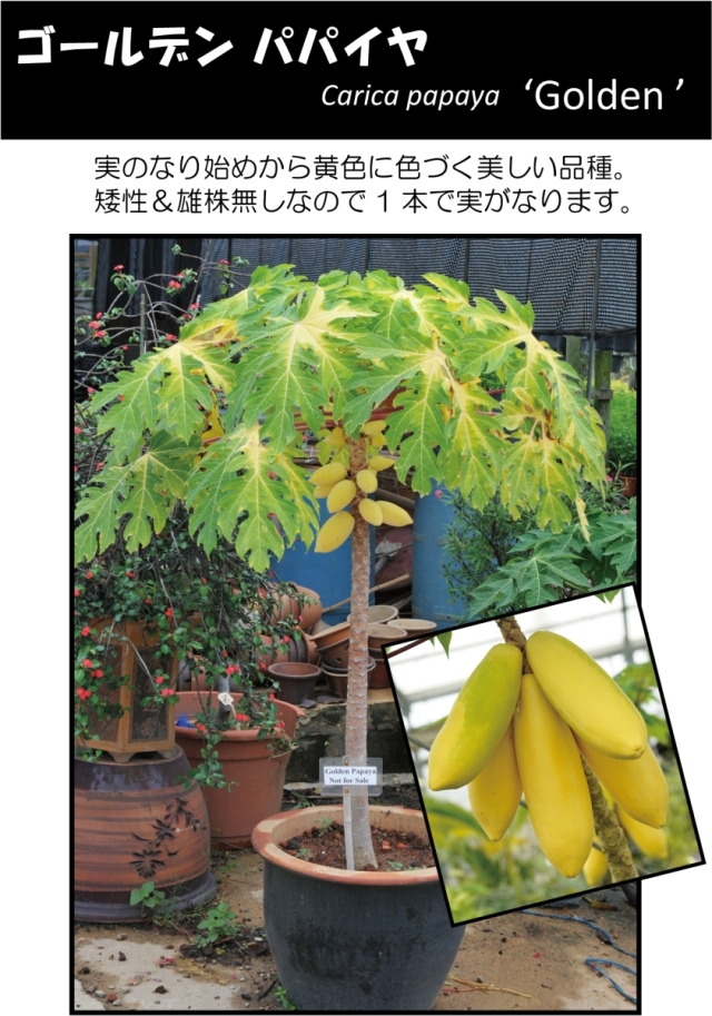 パパイヤの矮性品種で、実のなり始めから果皮が黄色くなる珍しいものです。 雌株と両性株がありますが、両方とも1本で結実します。 雌株は実が丸みを帯び、種なしになります。 両性株は実が長楕円形となり、中に種子が入ります。 黄色い未熟果は野菜として、オレンジ色に熟したものはフルーツとして楽しめます。